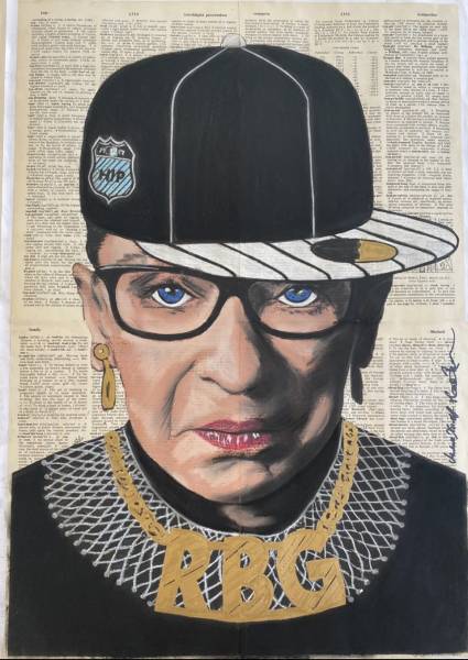 In 2020, the duo gifted an art piece they designed to Ruth Bader Ginsburg, wearing a Brooklyn Dodger’s cap. The U.S. Supreme Court Justice wrote them a thank-you note saying, “Your portrait of me with a Brooklyn Dodger’s cap is hanging in the entrance to my bedroom. It is a gem that lifts my spirits and brings smiles whenever I pass it.”