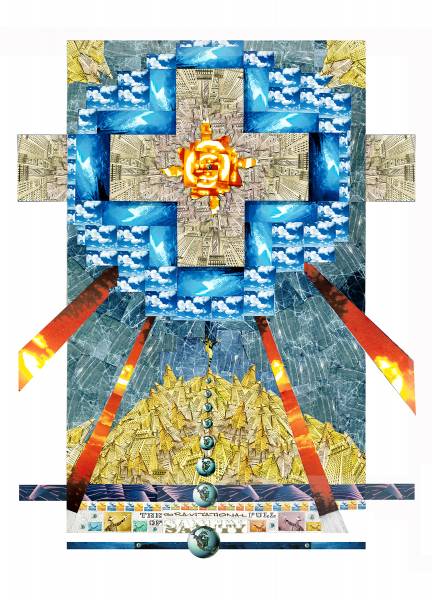 Stevens says that he calls his work “Kaleidoscopic Expressionism,” because he is trying to create things that are visually engaging but have something to say. His work is large in scale — nine feet long and five feet tall.
