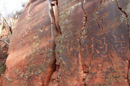 ホナキ(ホピ族の言葉で「熊の家」の意)とパラキ(ホピ族の言葉で「赤い家」の意)の2つの史跡はセドナで最も大きな史跡で、シナワ・インディアンの住居跡や壁画が見られます。パラキはセドナから約13マイル(21km)、ホナキはセドナから約17マイル(27km)北西にあります。(未舗装道路を運転します。)パラキは電話にて要予約(928-282-4119)。- VバーV・ランチ・ペティログラフ(壁画)・サイト: I-17から南に約3マイル(4.8 km)1150年から1400年のシナワ・インディアンの壁画がたくさん見られます。