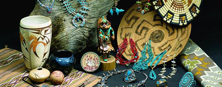 古典的なネイティブ・アメリカンのジュエリーから、ターコイスやシルバーなどを現代的にアレンジしたコンテンポラ リー・ジュエリーまで、コレクションは多様です。数々あるジュエリーショップを美術館気分で見て歩くこともできます。また、ネイティブ・アメリカンの敷物 やブランケットなどの織物、陶器、バスケット、楽器、カチーナ人形、などのショップも多数あります。